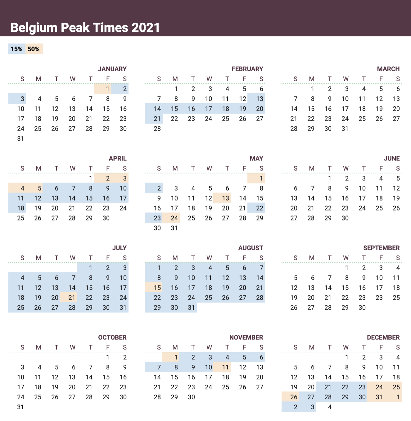 - Les dates marquées en bleu foncé sont majorées de 50%