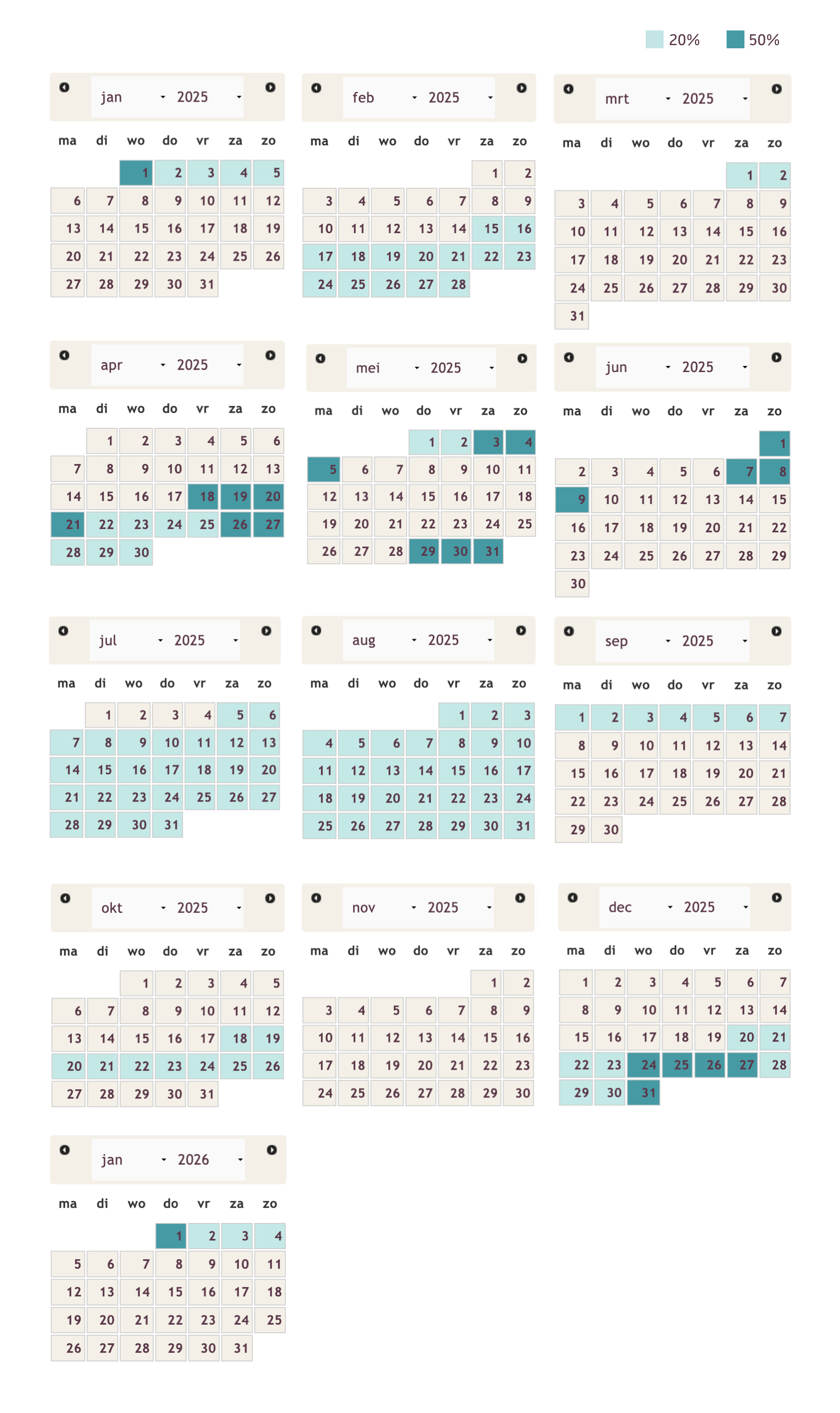 - Data gemarkeerd in donkerblauw hebben een extra toeslag van 50%.